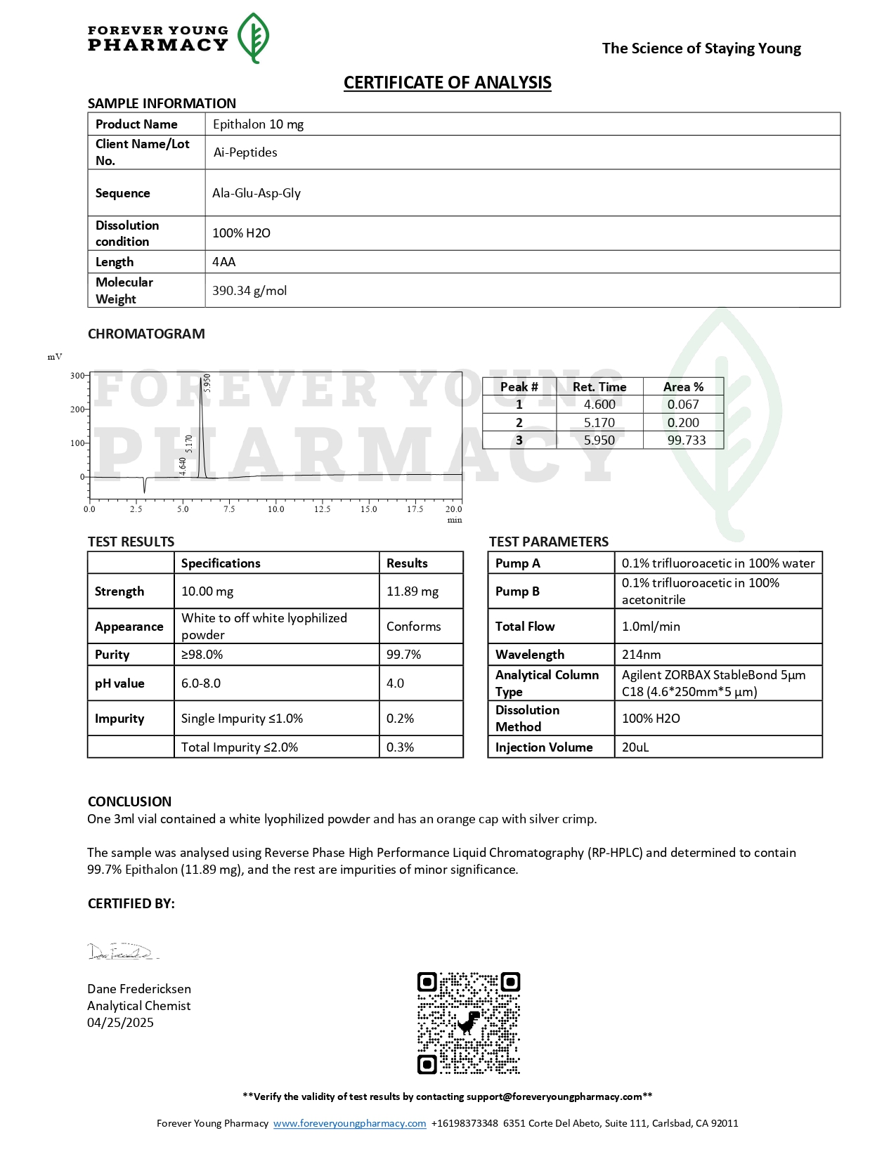 Epithalon (also known as Epitalon, Epithalone or Epithalamin) is a short synthetic peptide known to activate the telomerase enzyme and stimulate melatonin release. First developed in Russia in the 1980s, epithalon has been shown to delay age-related changes in reproductive and immune systems and increase the life span of mice and rats. Though it is primarily of interest in anti-aging research, epithalon has shown significant effects in certain types of cancer, infectious disease, and in DNA regulation.