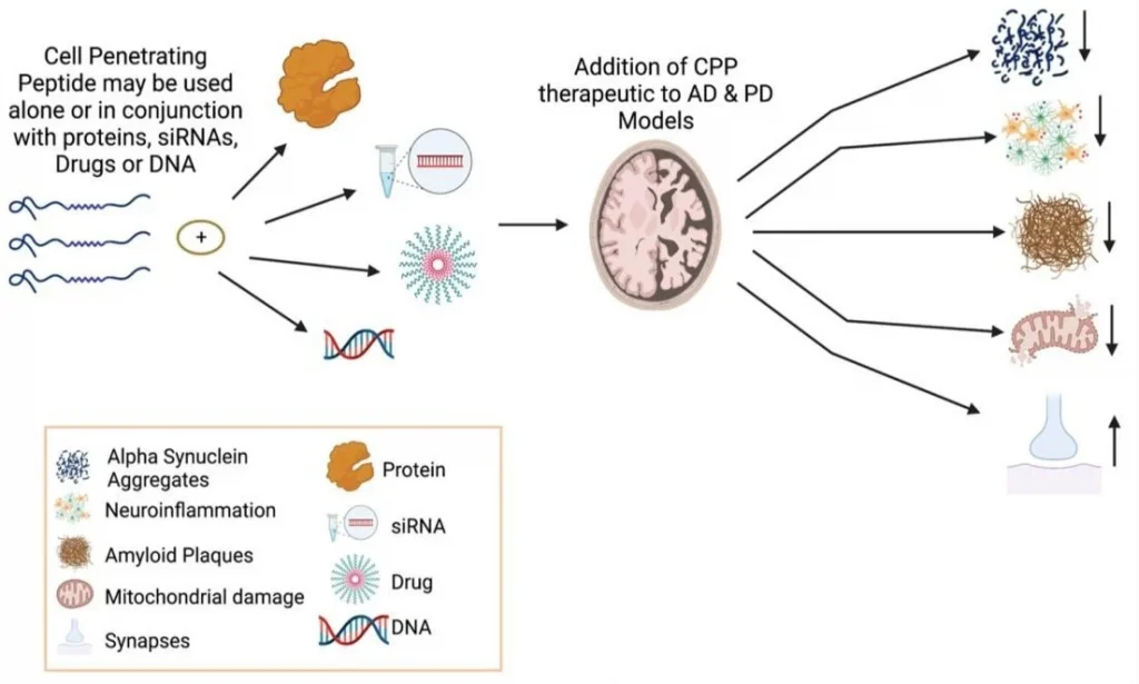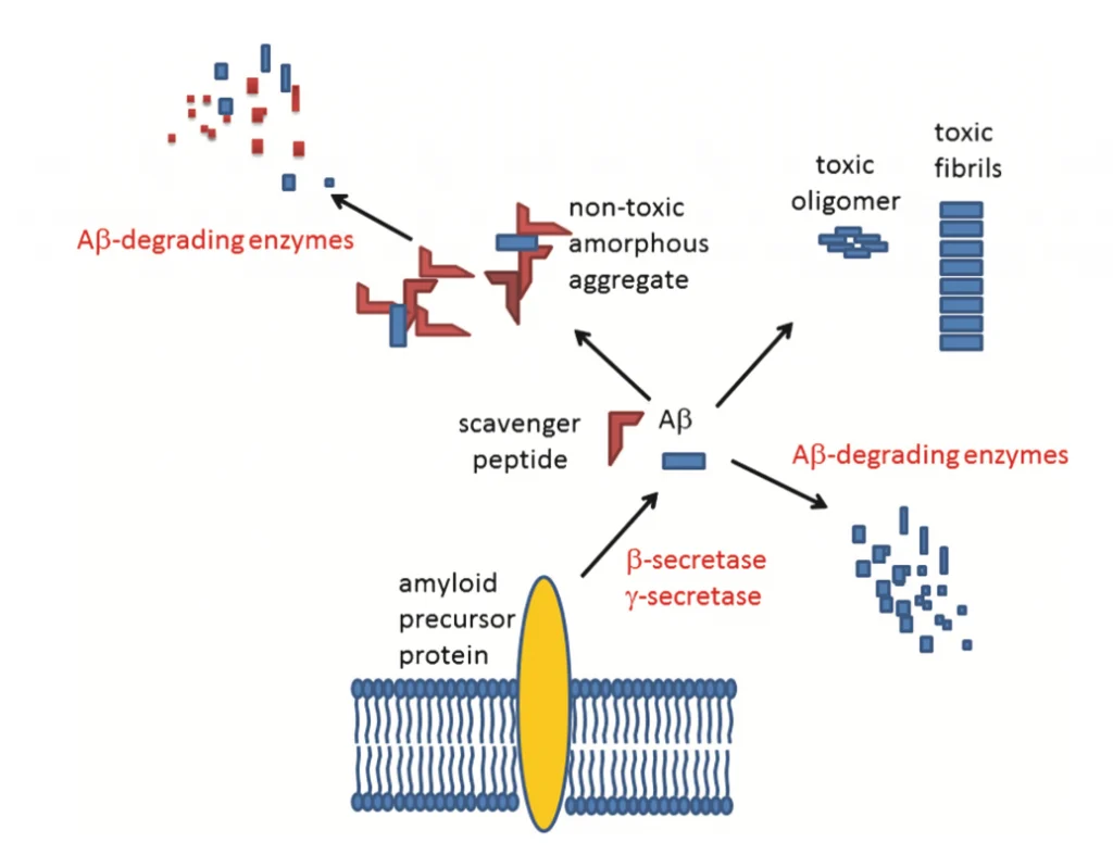 Several studies show that V24P (10-40) PEI decreases the accumulation and toxicity of both Aβ40 and Aβ42 in the hippocampus and the cortex of AD mice models (see Fig.2).[3,5] V24P (10-40) PEI peptide also significantly decreases the amyloid-β plaque aggregation in AD mice models.[7] It is well known that amyloid-β plaques and neurofibrillary tangles tend to accumulate in the olfactory bulb, damaging olfaction in the early stages of AD. [3] This novel peptide demonstrated that it could reduce both plaques and neurofibrillary tangles in the olfactory bulb.[3,6] For this reason, the V24P (10-40) PEI peptide is an excellent candidate for preventing the pathogenesis of AD from its early stages.[1-4]After testing different quantities (mg) of V24P (10-40) PEI, the investigators found that administering 1.6mg 6 times a week for eight months can reduce the amyloid-β in the hippocampus by 81%.[3] When comparing those results with other peptides made specially for decreasing the amyloid-β in the hippocampus, V24P (10-40) PEI shows the best performance (see Table 1).[3] Several studies suggest that V24P (10-40) PEI has excellent potential in slowing down the pathogenesis of AD by trapping and eliminating the overexpressed amyloid-β peptides in the olfactory bulb, hippocampus, brain cortex, and other possible areas.[2-4] AD is known to be a multifactorial disorder. However, a large percentage of patients show amyloid-β aggregation postmortem.[5] V24P (10-40) PEI is one of the few peptides tested in vivo, showing excellent results in decreasing self-aggregate proteins in the brain. [3,6] Stabilizing the amyloid-β levels in the brain can reduce neuronal cell mortality and memory loss, decreasing the chances of developing AD. [2]Â