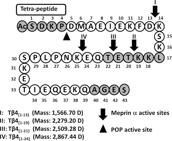 “Tβ4 is a naturally occurring peptide consisting of 43 base pairs of amino acids and generates the N-terminal tetrapeptide AcSDKP.” (14)