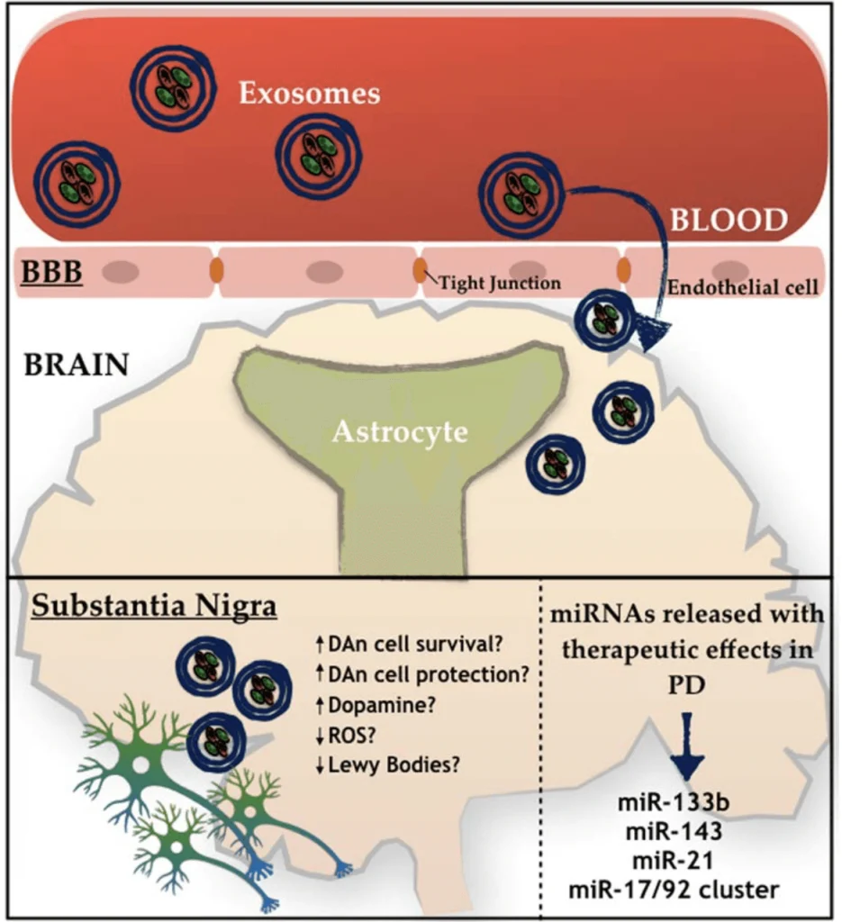 Some benefits of using miRNAs as a therapy for PD are the following: (1) miRNAs can target specific genes involved directly in the apoptotic pathway (specificity). (2) miRNAs are molecular switches, activating or inhibiting the apoptosis pathway. This adaptive characteristic is very convenient for this type of therapy since PD requires, in some cases, the inhibition of neuronal death (dopamine-producing neurons) and the activation of apoptosis in unwanted cells in the brain. (3) miRNAs can cross the blood-brain barrier and enter into cells, which is a challenge in developing neurodegenerative diseases. The apoptosis pathway accelerates the progression of PD by the direct dopamine depletion caused by the death of dopamine-producing neurons.[4-6] As the disease progresses, more and more neurons are lost, leading to worsening symptoms and disability.