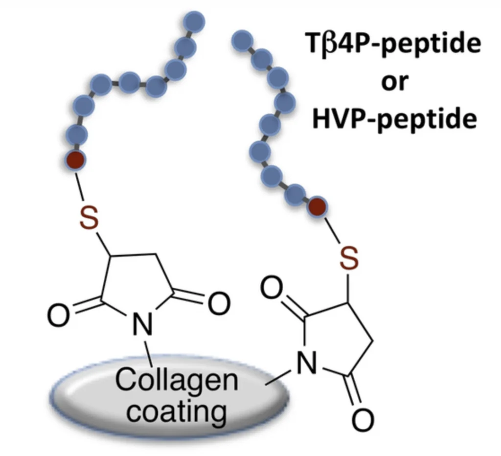 Tβ4P and HVP are known to exert proangiogenic and proadhesive activity respectively, and HVP is involved in osteogenesis promotion. The ability of these peptides to increase collagen cell adhesion and angiogenesis properties is assessed on human cell lines. See image below showing the peptides grafting strategy to collagen coatings.